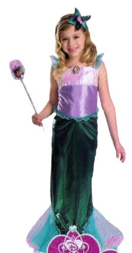 Under the sea and on dry land, she'll look adorable in this Disney Princess Little Mermaid Ariel Child Dress Up Size 3T-4T Costume! Costume Features polyester mermaid style satiny dress with sparkles and lacy accents. A headband featuring a pretty shiny flower is included. Add a pretty wand for a finishing touch (not included).