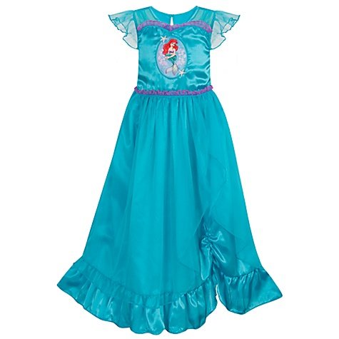 Your little mermaid will be swimming and twirling under the sea in her dreams when she wears this elegant Ariel Nightgown. Plenty of ruffles and a satin bodice will help her rest in luxury while she dreams of flipping her fins.Product Details * Ariel appliqué with embroidered detailing * Ruffled organza sleeves * Turquoise skirt with gathered flounce and ruffled trim * Organza overskirt * Keyhole button in back * Polyester/nylon * Imported